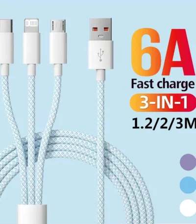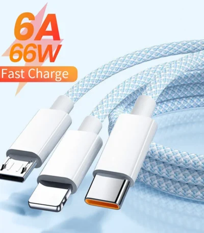 1.2M/2M/3M 6A 66W 3 in 1 Fast Charging Cable USB Type C Cable Multi Mobile Phone Charger USB C Data Cable for Xiaomi Huawei