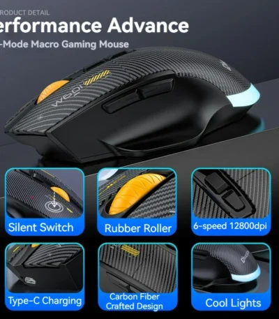 12800DPI 2.4G Wireless Bluetooth Wired Tri-mode Mouse Mute Button Macro Programming Carbon Fiber Gaming Mouse 500mAh 7 Keys