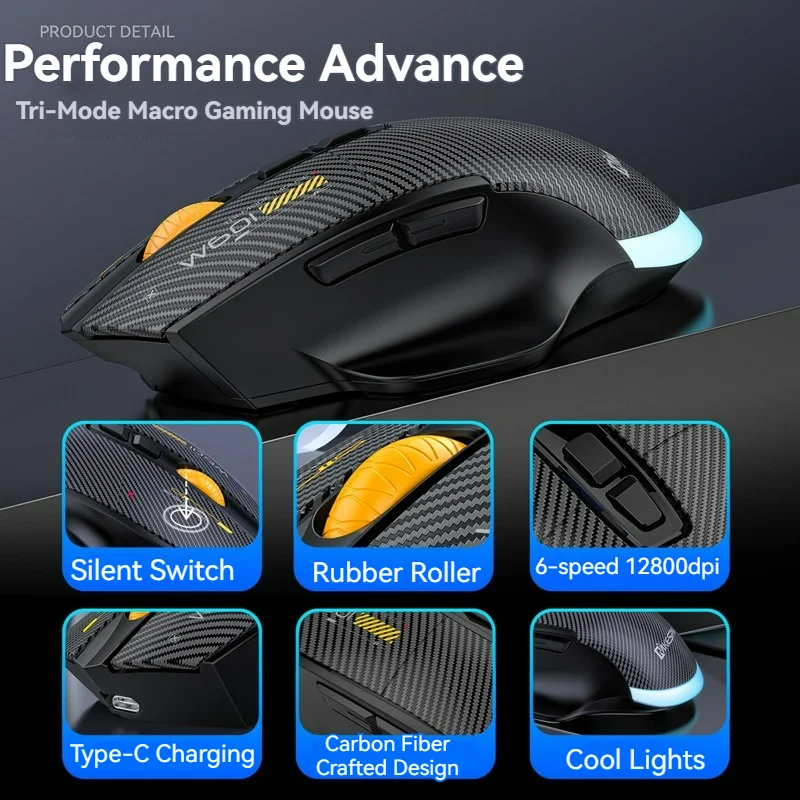 12800DPI 2.4G Wireless Bluetooth Wired Tri-mode Mouse Mute Button Macro Programming Carbon Fiber Gaming Mouse 500mAh 7 Keys