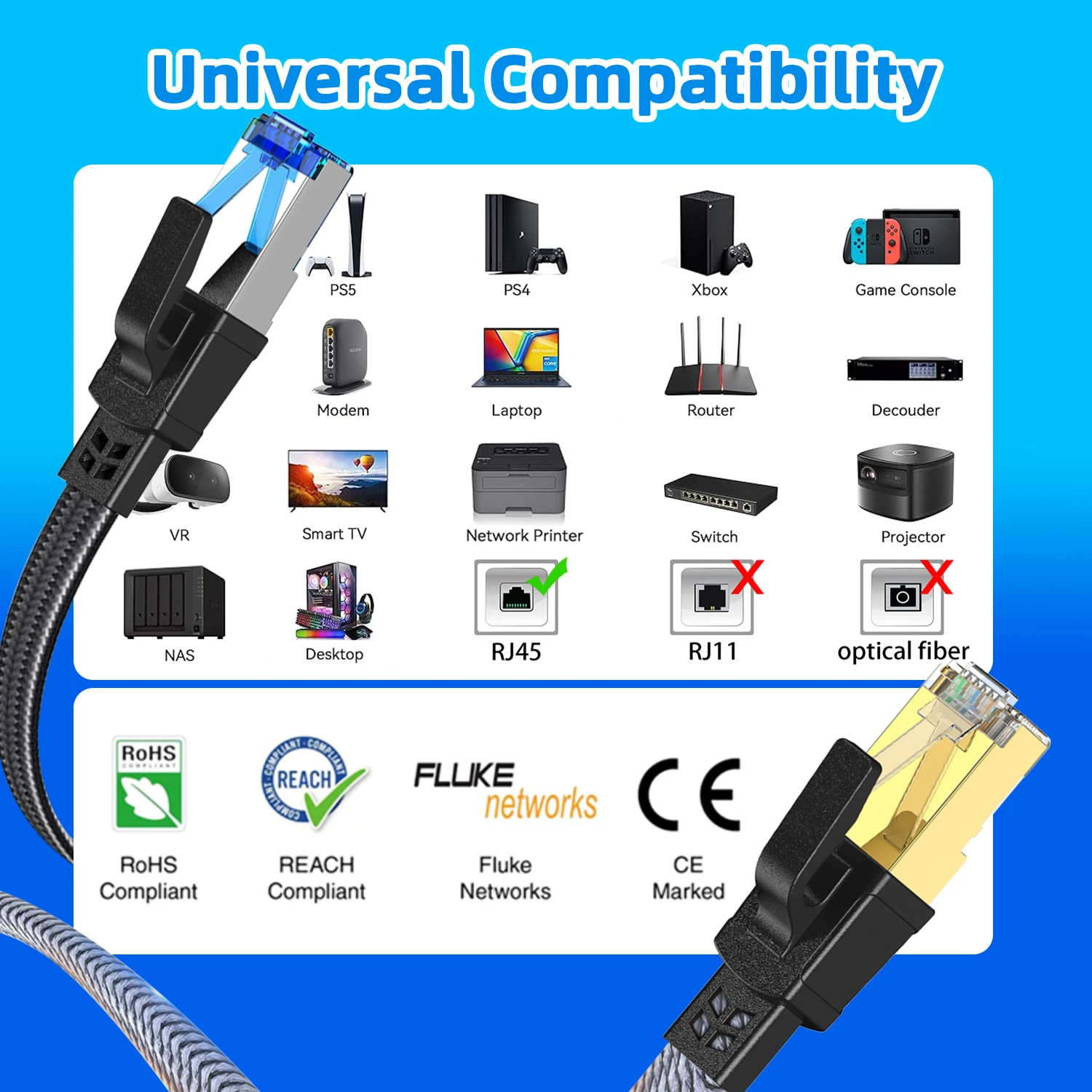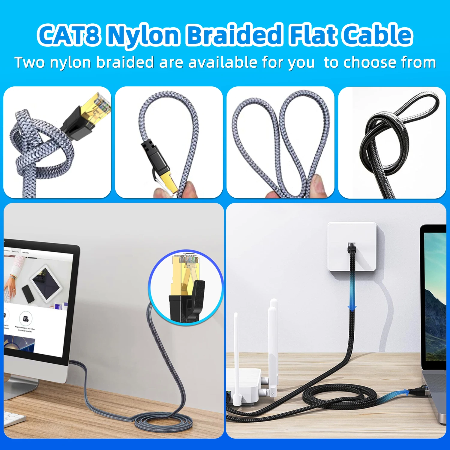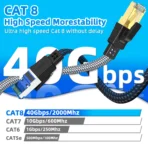 CAT 8 cable compatible with CAT7, CAT6, CAT5 cable standards. ?Flat cat8 Eethernet cable constructed with the rj45 connector makes it perfects for servers, TV, TV Box, laptop, PC, printer, networking switch, routers, ADSL, adapters, hubs, modems, PS3, PS4, x-box, Patch panels and other device with RJ45 connectors.