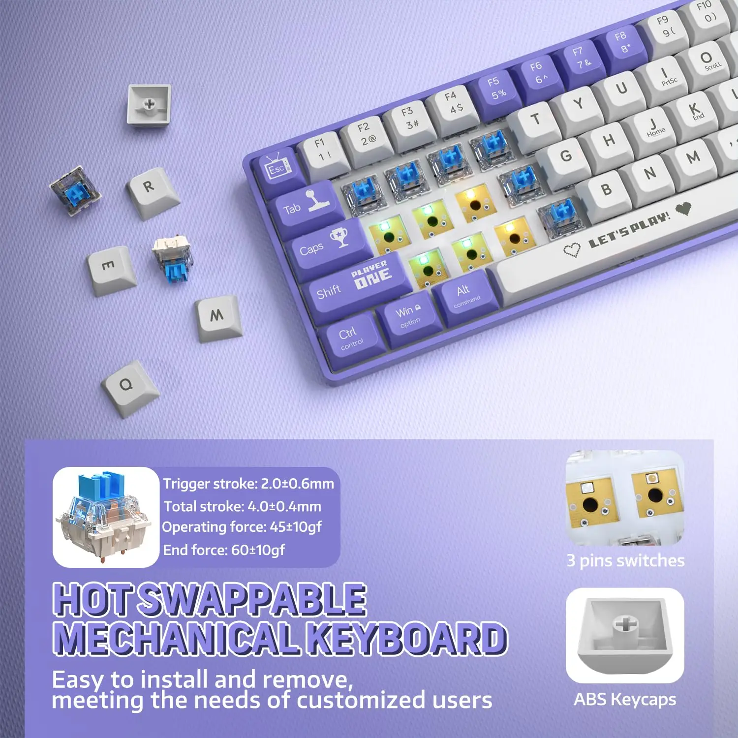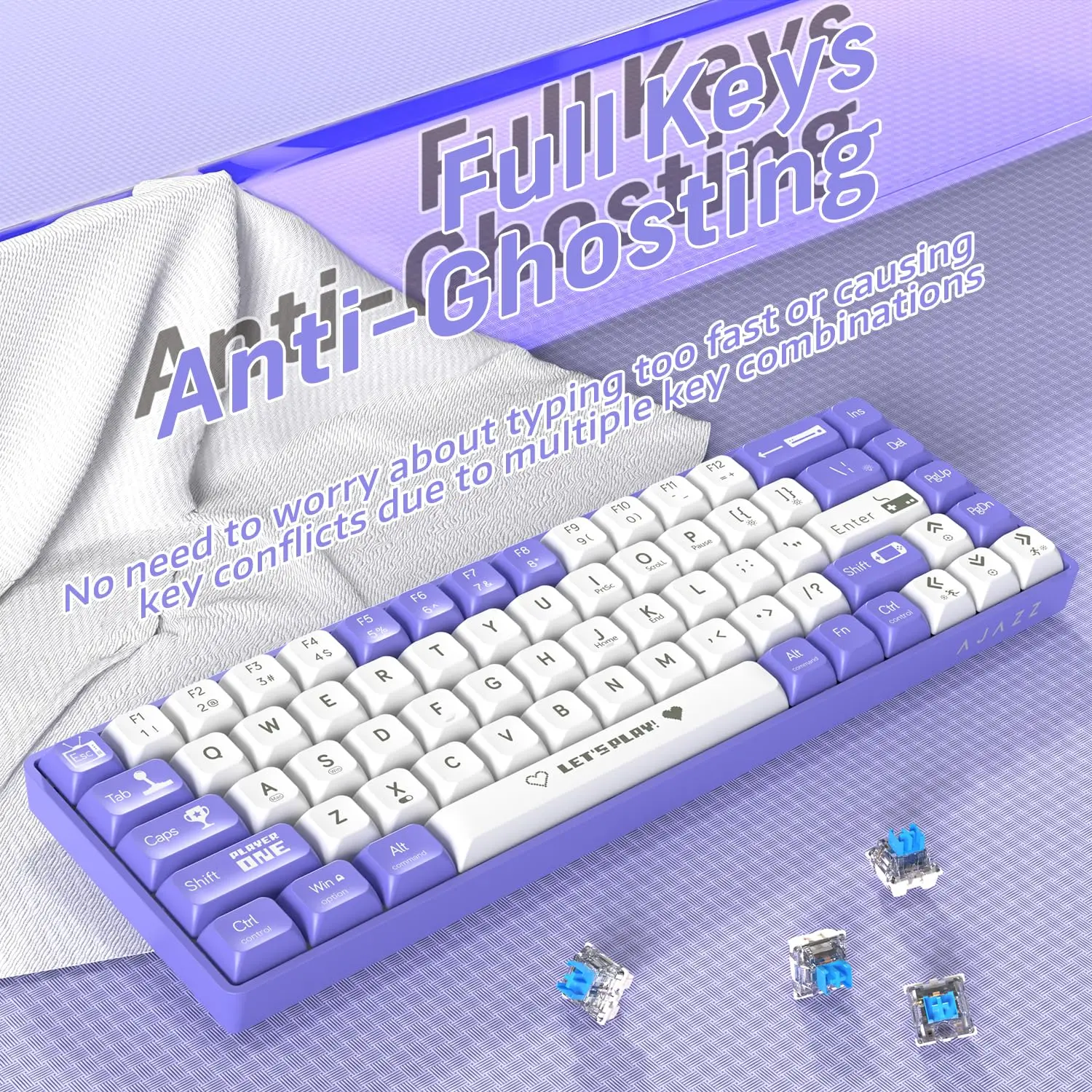 4.Unique Two-Patch Color&Fully Anti-Ghosting:This AK680 keyboard is designed with a unique two-color design that makes it even more eye-catching in appearance,available in purple-white,red-white, and gray-white.Its keycaps feature playful patterns for added charm and delicate.The wired mechanical keyboard features full key anti-ghosting to ensure that gamers and office workers can enjoy outstanding stability and reliability in fast-paced games or working.