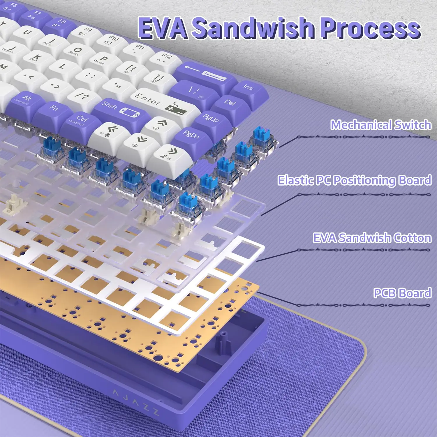 3.UV Printing& EVA Sound Control:This Keyboard adopts UV printing technology for long-lasting and durable patterns that won't fade.The XDA height keycap design provides a more comfortable keystroke feel for long hours of use without fatigue.Precision-tuned satellite axes and self-lubricating customized axes ensure smooth and stable keyboard operation.Professional EVA sandwich sound control foam effectively reduces the sound of keystrokes,creating a quieter working and gaming environment.