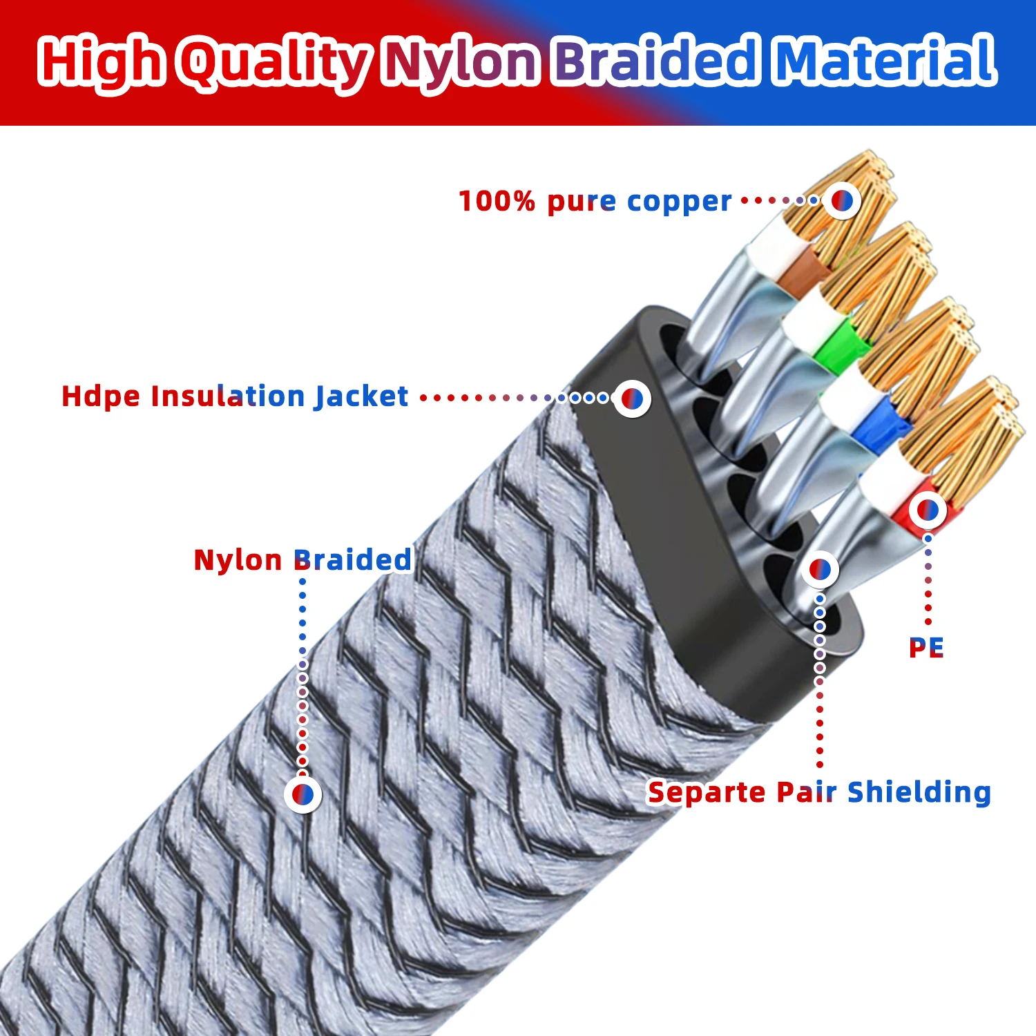 HENGSUR professional network cables are made of nylon braided housing to increases the wear resistance of the product, reduces the risk of use due to housing wear, and studies indicate that the product is further enhanced. And 4 shielded foiled twisted pair(F/FTP) copper wires. Compared to the Cat 7 network Ethernet cable, the additional shielding and improved quality in twisting of the wires provides better protection from crosstalk, noise, and interference that can degrade the signal quality. This will increase the reliability and accuracy of the data transfer.