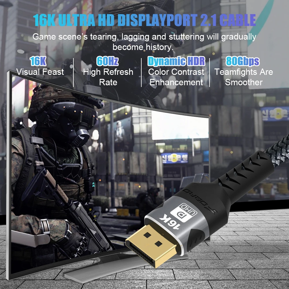 DisplayPort Cable 2.1 16K DP Cable with Nylon Braided 16K@30Hz 8K@60Hz HDR FreeSync Video Cable for Displays Monitors Graphics