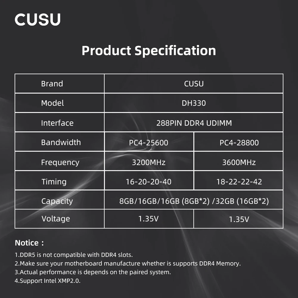 CUSU Black Heatsink DDR5 gaming memory can run up to 6000MT/s. Each 288-pin DIMM is equipped with PMIC (Power Management IC) and ECC (Error Correcting Code), featuring a more stable performance and high-speed operation. Armored with aluminum alloy heatsink, the memory modules function with better heat dissipation. With selected originally produced IC and other parts, they have undergone rigorous tests on compatibility, reliability and overall performance.