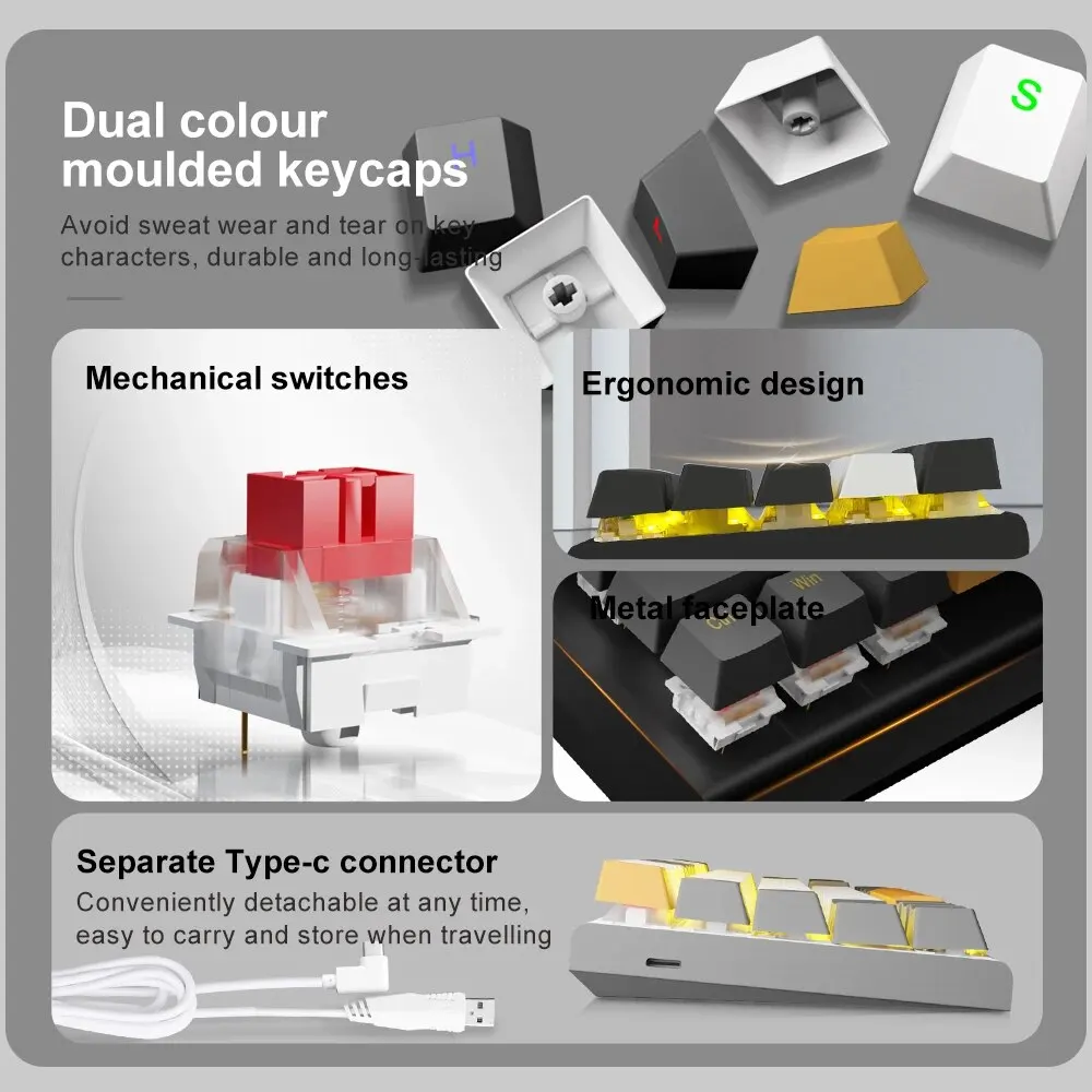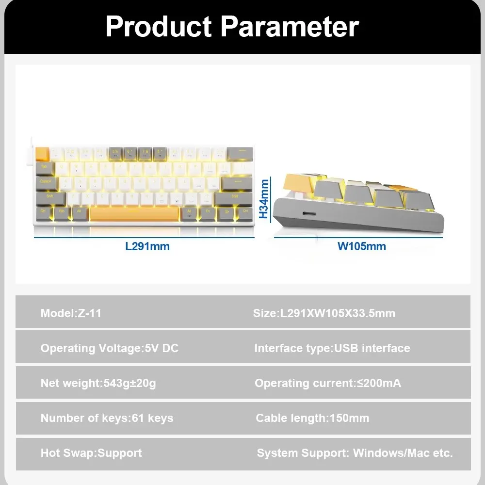 ?Portable 60% Percent Mechanical Keyboard?: This is a 61 keys compact mini mechanical keyboard with metal panel and type-c removable connecting line, it's good for all environment, business travel games office home use, without Numpad, more practical for Gamers and Typist, give more space to your desktop.